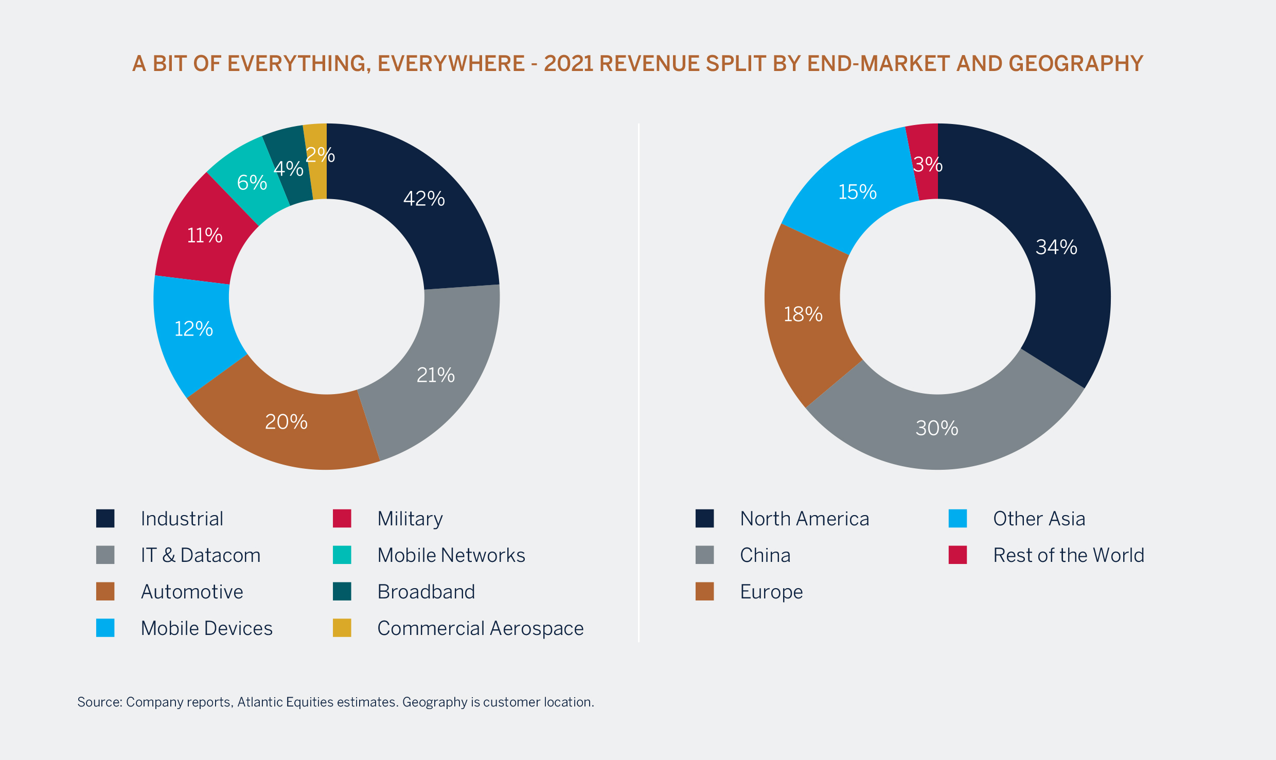 It is easy to see the electronification of everything under the sun continuing for many years and decades to come, driven by increased connectivity and automation. The proliferation of electronics has helped to increasingly diversify Amphenol over the past two decades across a wide breadth of end markets and 1,000s of products (albeit all within its sphere of expertise). Its core communications-related sales (i.e. IT & datacom, mobile networks, mobile devices and broadband) has declined from 65% of revenue in 2000 to 43% in 2021 as the automotive and industrial markets contributed to a growing pie.