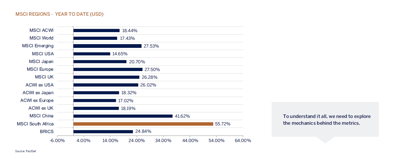 When we do this, we typically find paradoxes. South Africa is a case in point. GDP growth alone suggests a stagnant economy. Regardless of which measure you rely on, in real terms, GDP is stuck. However, if we turn to the stock market, we get a very different picture. The JSE is performing well. In fact, it is one of the world’s top performers of late. The MSCI South Africa Index has returned more than 30% dollar returns for the year to date. This is far above even the secondbest performer among the MSCI regions, China, with just under 23%.